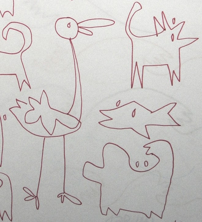 Desde então desenhamos frequentemente, seja em papel, seja numa lousa branca que penduramos na parede, seja numa daquelas lousinhas mágicas. Ele vai entendendo que podemos criar imagens e também escrever, comunicando algo, uma mensagem, uma lista de compras. Tudo de maneira espontânea e respeitando seu interesse.
